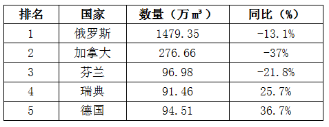 2021年一季度我國鋸材進口量為566.19萬立方米,比上年同期增長13%、進口金額下降0.2%。PS:沒有從美國等國進口優(yōu)質鋸材,進口單價下降,所以,進口數(shù)量增加,進口金額下降。 鋸材進口排名前五位的國家