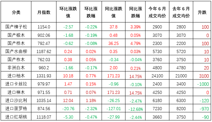 6月份,傳統(tǒng)淡季氛圍愈發(fā)濃郁,鋸材分類指數(shù)走出綠盤調(diào)整行情,月指數(shù)報收784.80點,環(huán)比下跌0.79%。各大市場當(dāng)中,廣東魚珠鋸材指數(shù)報收1070.11點,環(huán)比上漲0.75%,上海福人鋸材指數(shù)收于1219.41點,環(huán)比下跌0.78%,四川大西南鋸材指數(shù)報收1059.44點,環(huán)比下跌3.78%,江西南康鋸材指數(shù)收于1644.40點,環(huán)比下跌0.04%。