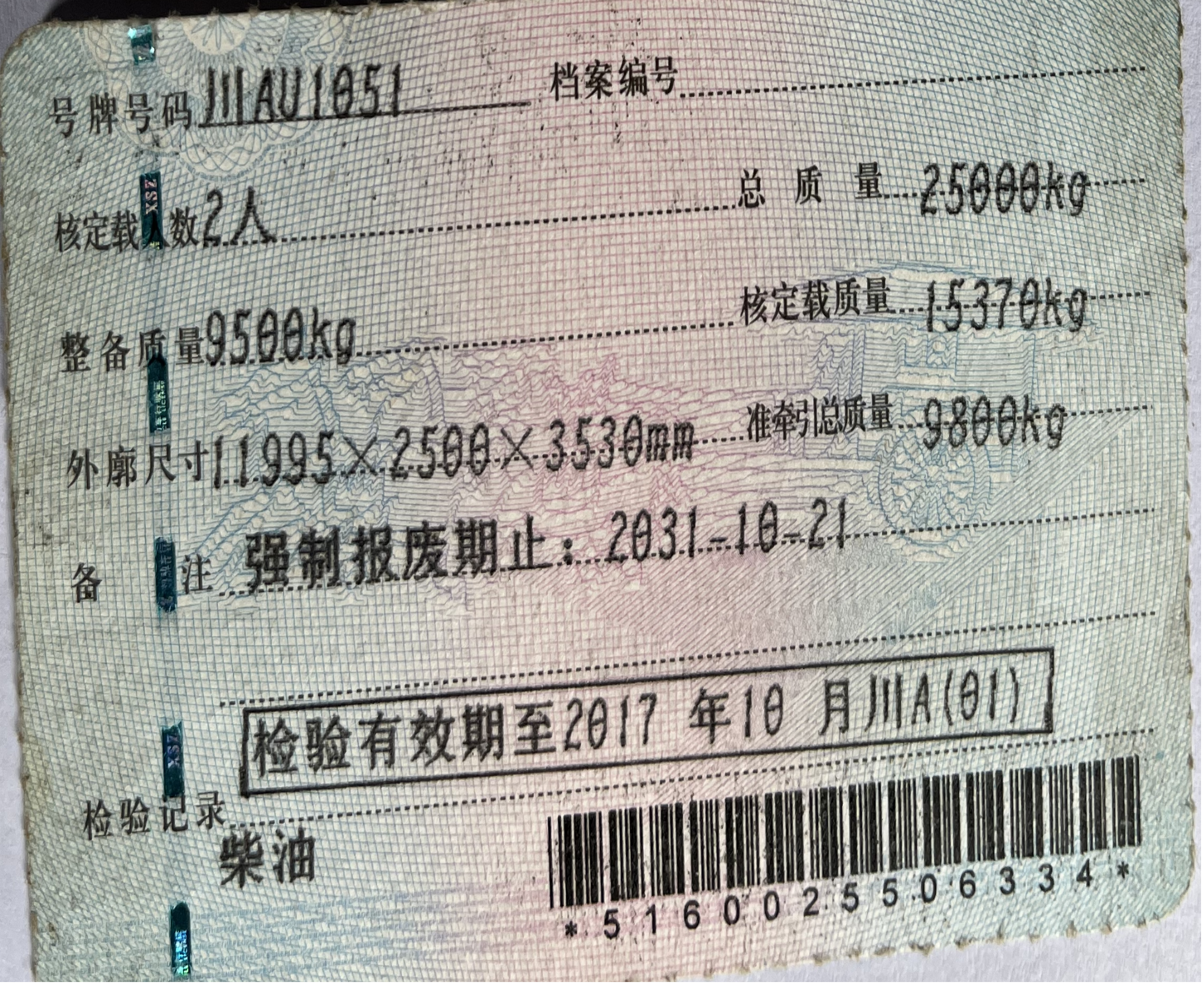 1. 解放牌貨車(川AU1051)2022年10月至2024年10月;