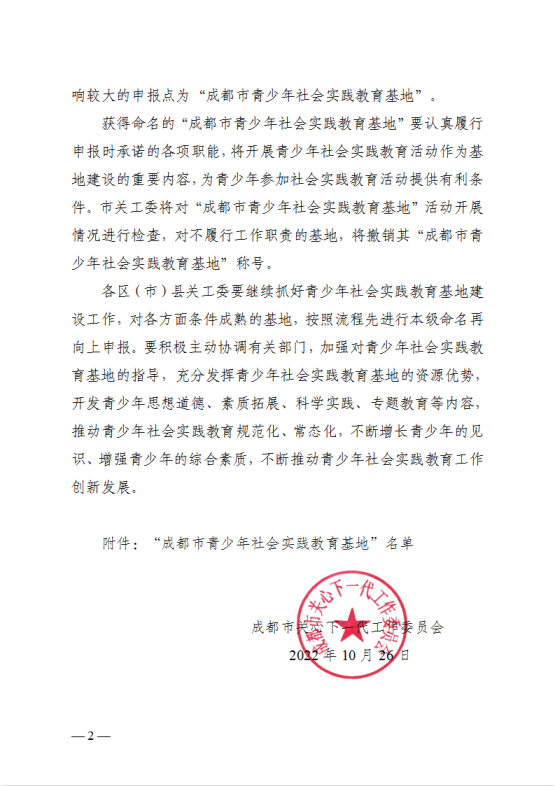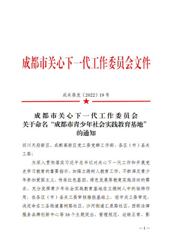 2022年10月26日,成都市關(guān)心下一代工作委員會(huì)發(fā)布了《關(guān)于命名“成都市青少年社會(huì)實(shí)踐教育基地”的通知》,四川木文化國(guó)際交流中心被命名為“成都市青少年社會(huì)實(shí)踐教育基地”。