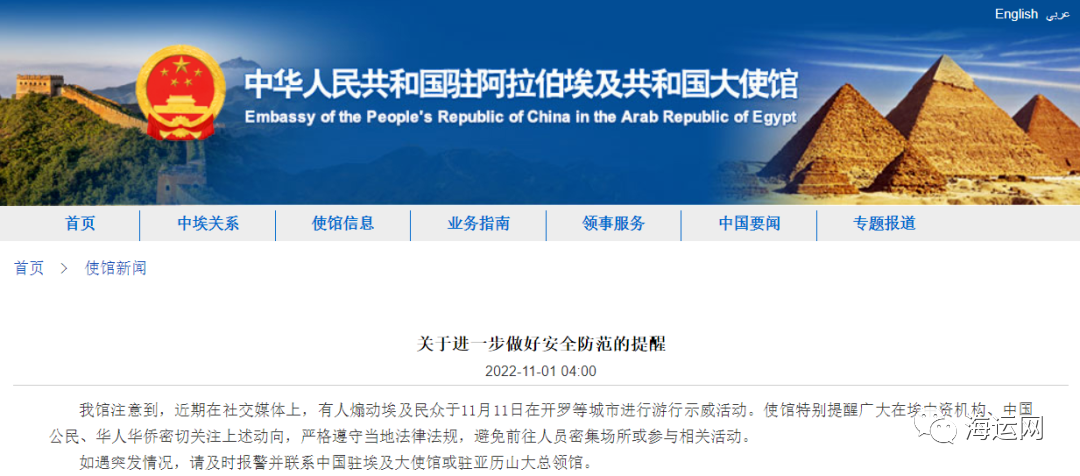 當(dāng)前埃及國內(nèi)經(jīng)濟(jì)形勢(shì)危機(jī)四伏,可能對(duì)中國在埃企業(yè)以及對(duì)埃出口企業(yè)造成影響。此前,中國駐埃及大使館已就埃及當(dāng)?shù)鼐謩?shì)發(fā)布“關(guān)于進(jìn)一步做好安全防范的提醒”。