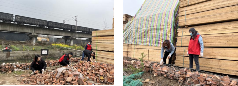 最后,大家將拾取的磚塊統(tǒng)一集中到園區(qū)長流河邊用以防洪筑堤。
