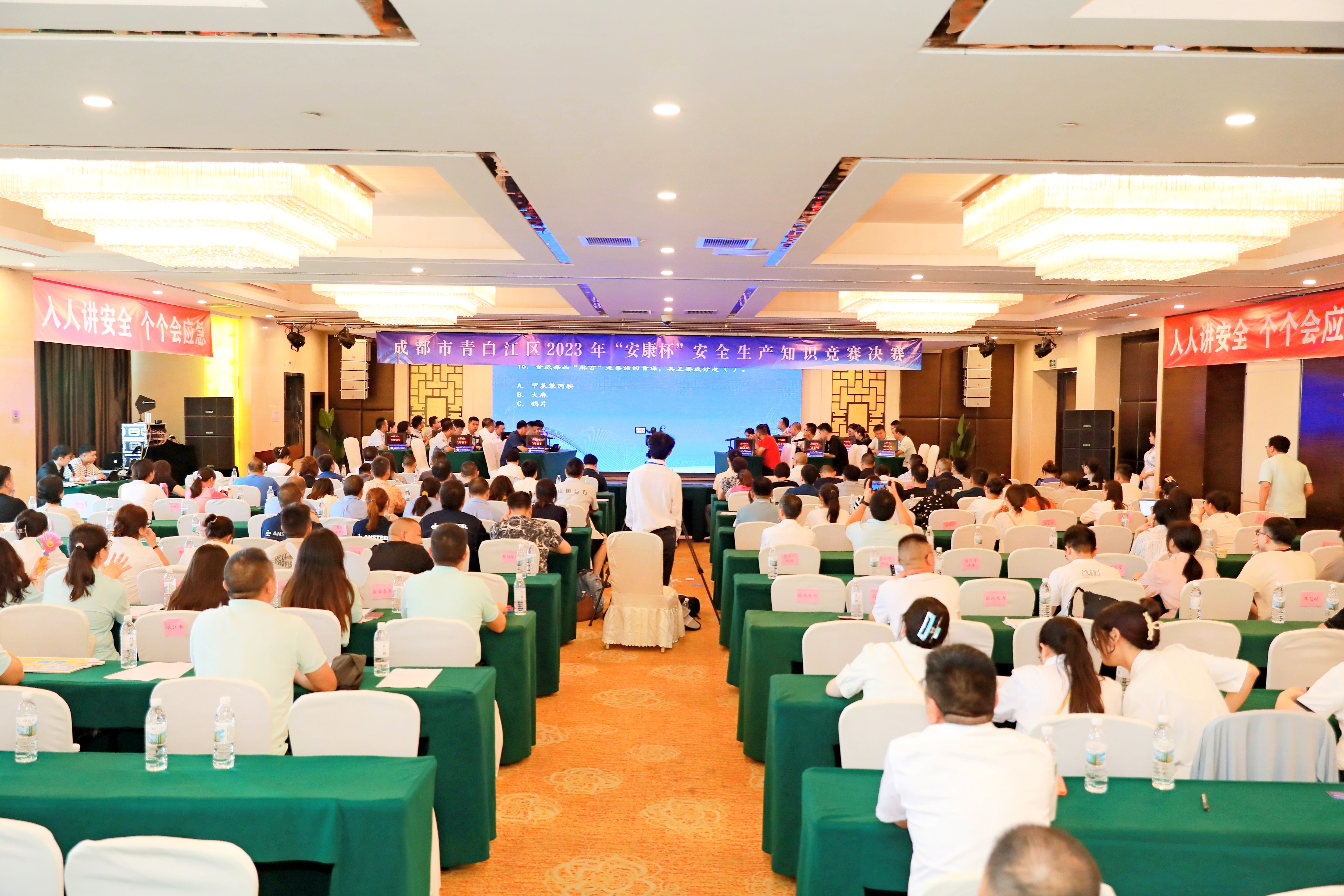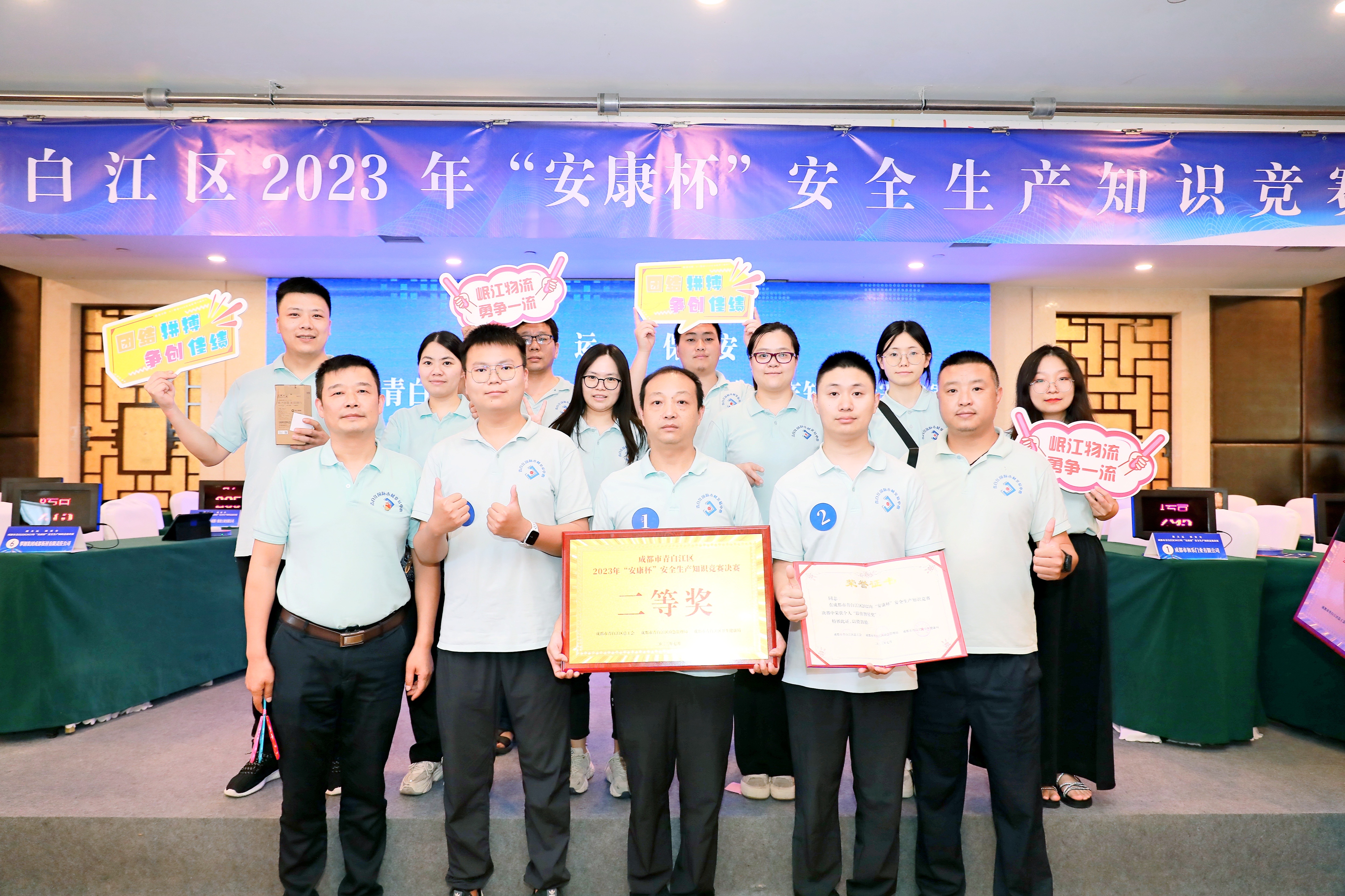 知識競賽分初賽、復(fù)賽和決賽三個環(huán)節(jié)進行,通過前期培訓(xùn)、線上答題,物流公司于7月7日參加復(fù)賽,最終以復(fù)賽筆試第一名的成績進入決賽。7月14日,決賽在青白江區(qū)茂文酒店茂文廳舉行。決賽當(dāng)日還專門組織一支啦啦隊,由公司黨總支書記宋詩偉帶隊到現(xiàn)場為參賽隊員加油助威。