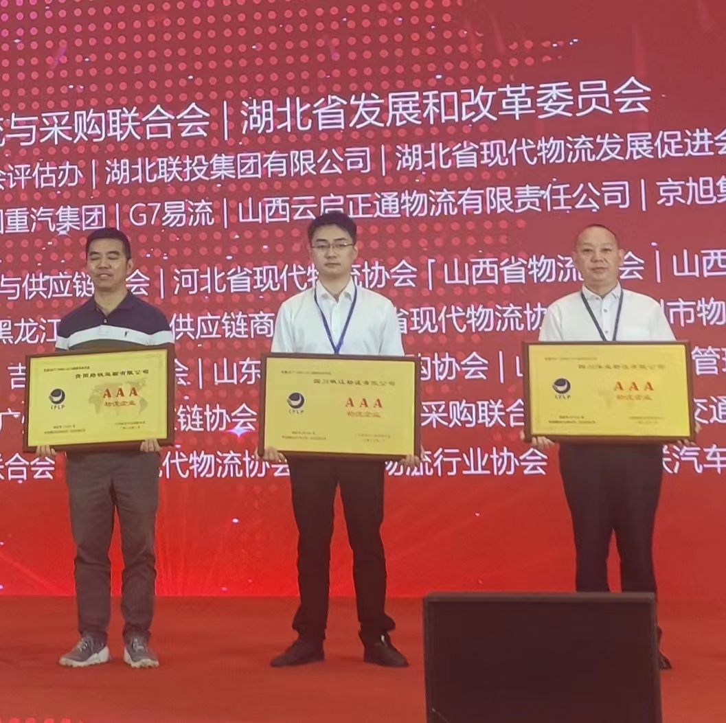 會上,中國物流與采購聯(lián)合會向本批次獲得A級物流企業(yè)、擔(dān)保存貨管理及質(zhì)押監(jiān)管企業(yè)、星級冷鏈物流企業(yè)、網(wǎng)絡(luò)貨運(yùn)平臺企業(yè)的代表頒發(fā)了證書及牌匾。四川岷江物流有限公司被授予“AAA物流企業(yè)”稱號。