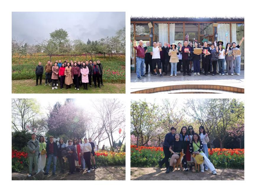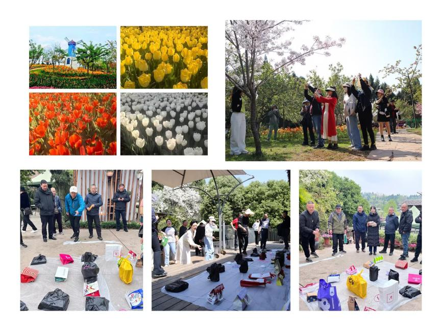 踏入山頂,五彩斑斕的郁金香花田帶來強(qiáng)烈的視覺沖擊,白的像雪、紅的似火、粉的如霞,一片片郁金香整齊排列,宛如絢麗畫卷。職工們穿梭其中拍照留念。不遠(yuǎn)處的櫻花林里,花瓣隨風(fēng)飄落,如夢如幻,大家在此打卡拍照,歡聲笑語不斷。