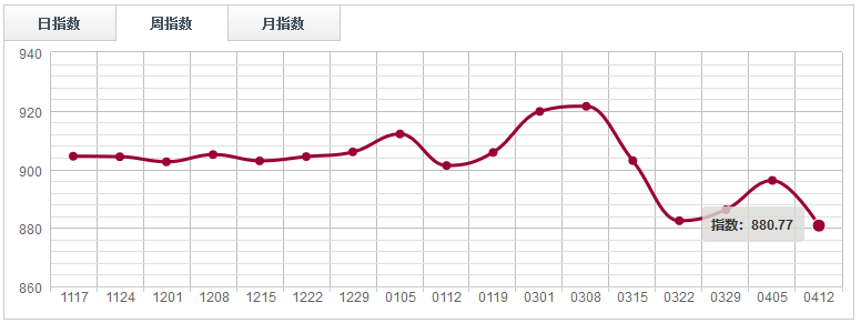 本周人造板指數(shù)陰跌回落,報收880.77點,環(huán)比下跌1.72%。其中魚珠人造板指數(shù)、大西南人造板指數(shù)、臨沂人造板指數(shù)分別下跌0.25%、5.53%、0.77%;福人人造板指數(shù)上漲1.23%。